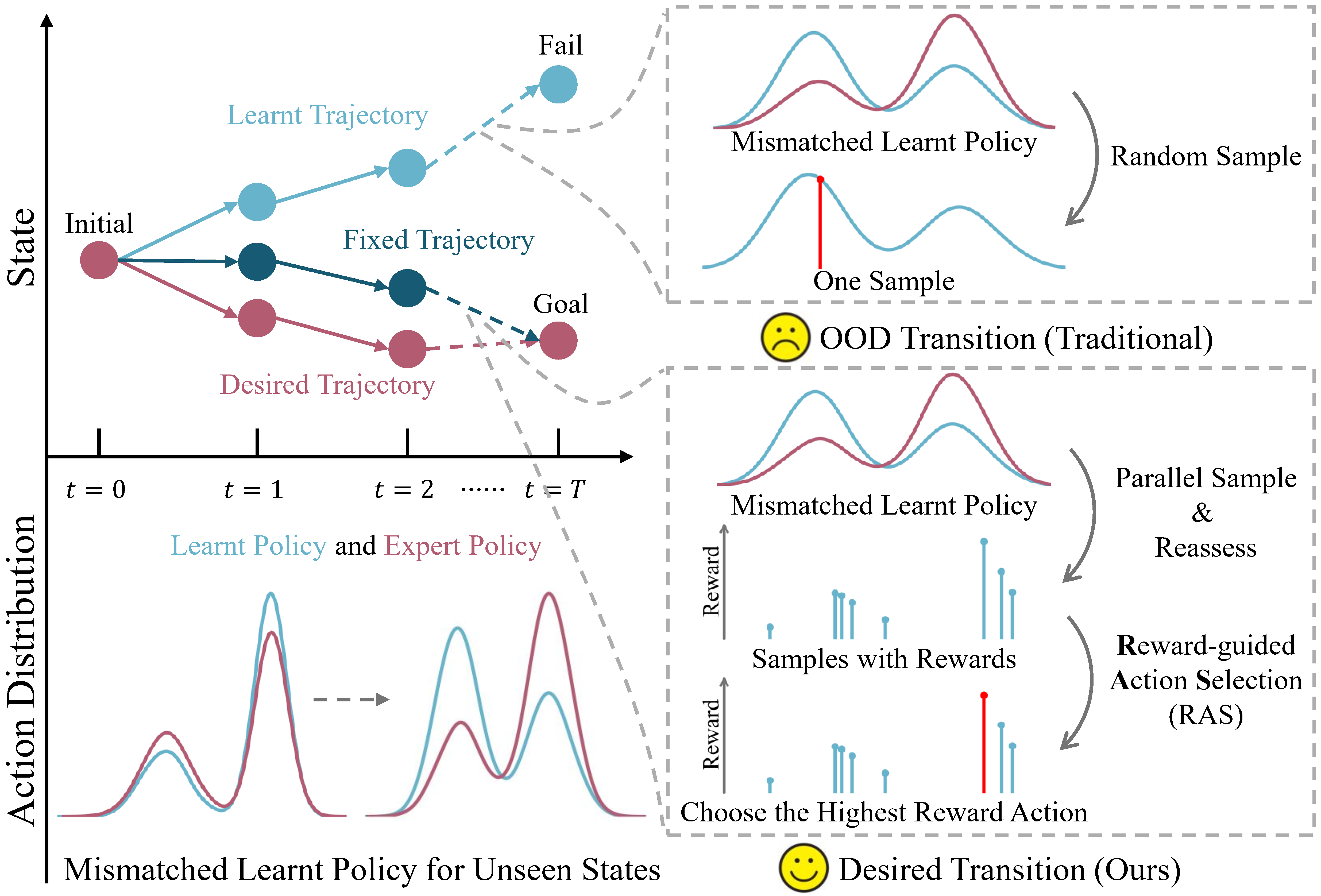 We analyzed the distribution of normalized implicit reward values during inference, as shown in Fig. 6a. This indicates that there is no positive correlation between the sampling probability of the action generation model and the predicted reward values, which suggests that employing reward-guided action selection can serve as a quality reassessment.